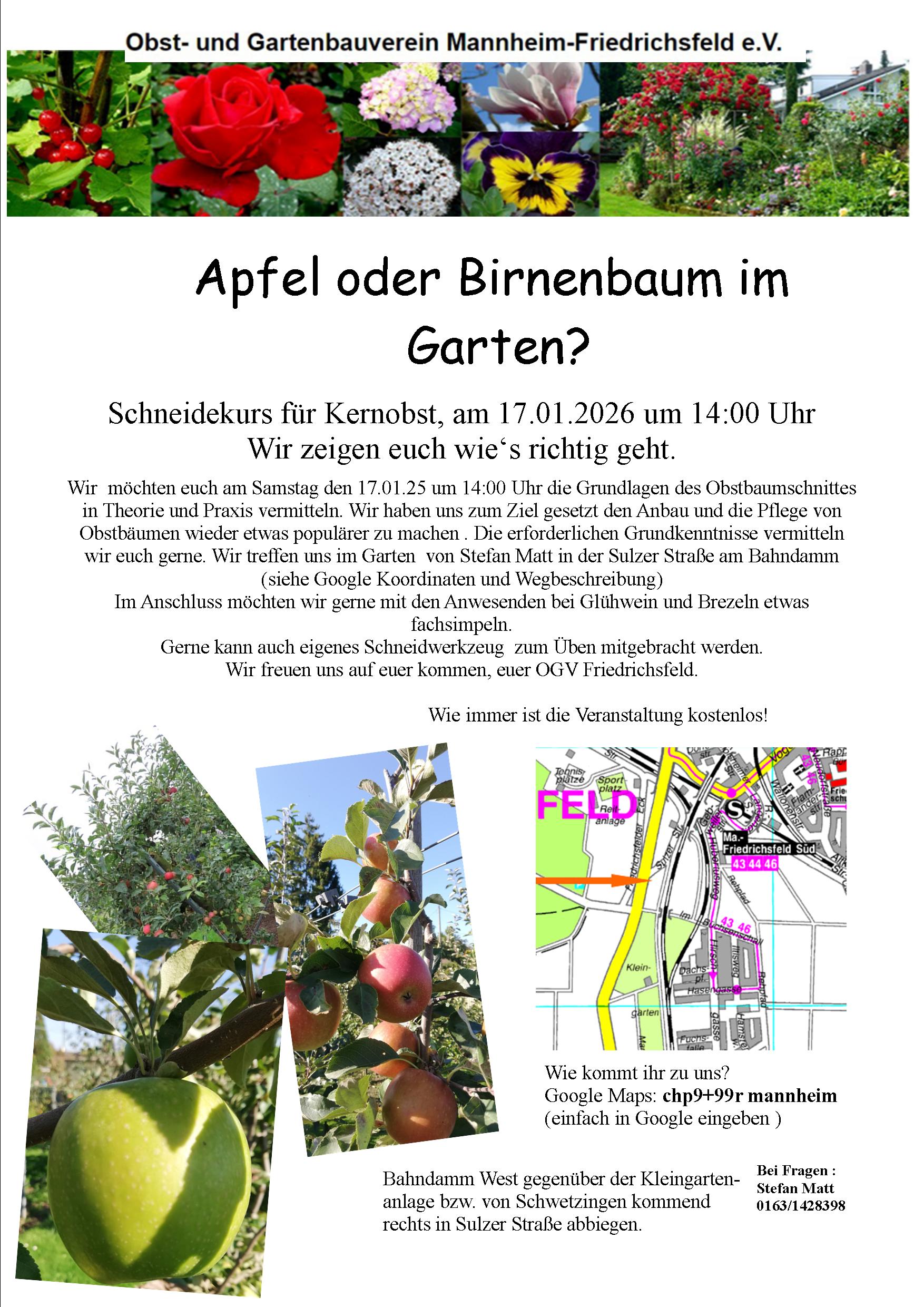 Gerne möchten wir euch zum ersten Schneidekurs in 2026 unter dem Motto „Wir zeigen euch wie’s richtig geht“ einladen. Unser Vorstand und Baumwart Ludwig Mühlbauer vermittelt euch in Theorie und Praxis die Grundlagen des Obstbaumschnittes.